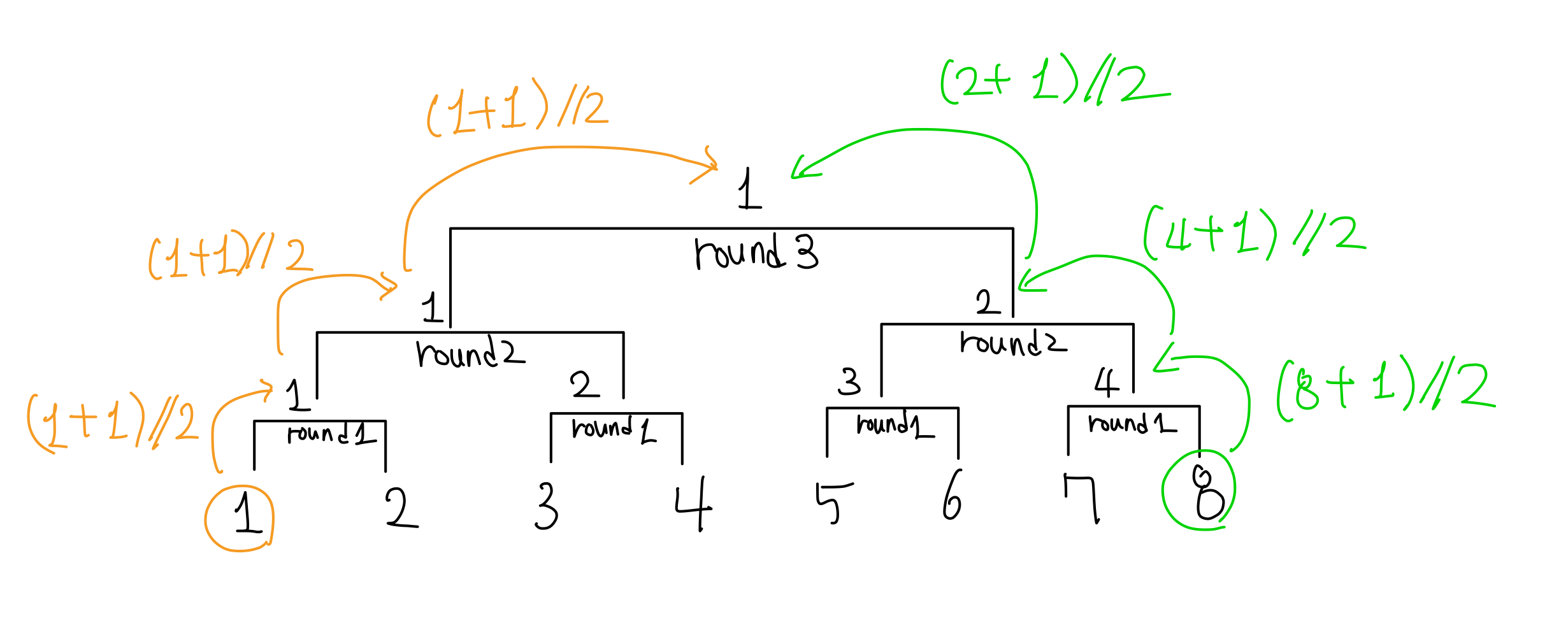 각 번호는 다음 라운드에서 (n+1) // 2의 번호를 부여받습니다. (1,2 -> 1 / 3,4 -> 2 /...)