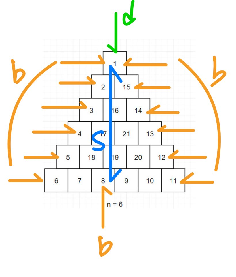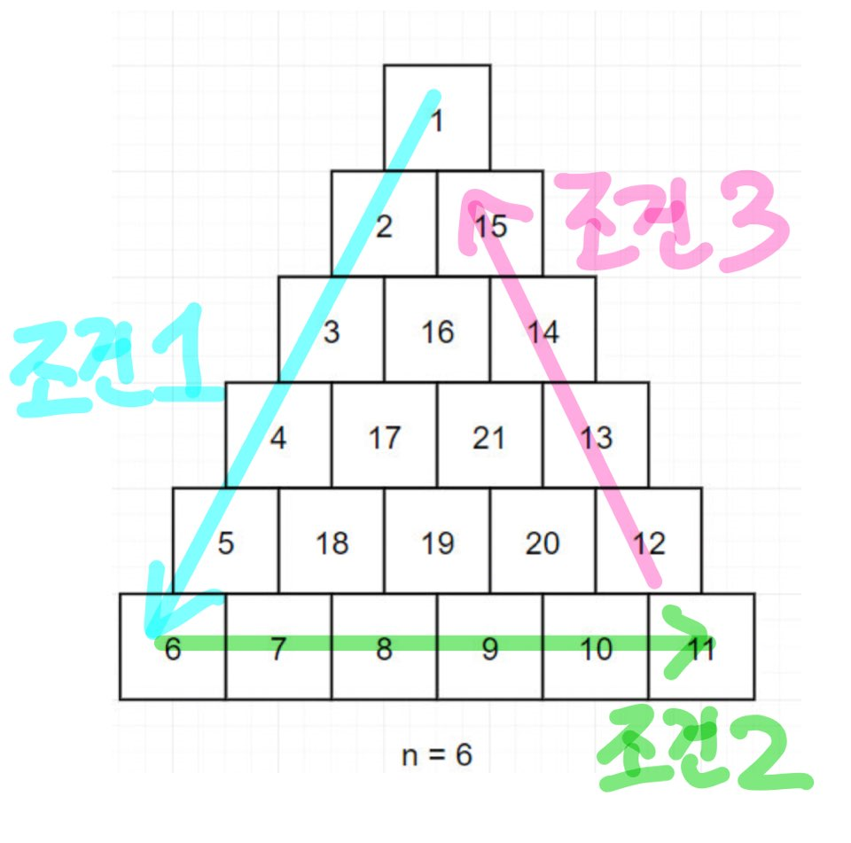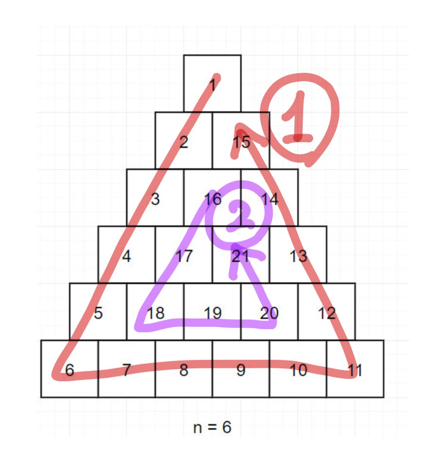정수 n이 매개변수로 주어집니다. 다음 그림과 같이 밑변의 길이와 높이가 n인 삼각형에서 맨 위 꼭짓점부터 반시계 방향으로 달팽이 채우기를 진행한 후, 첫 행부터 마지막 행까지 모두 순서대로 합친 새로운 배열을 return 하도록 solution 함수를 완성해주세요.