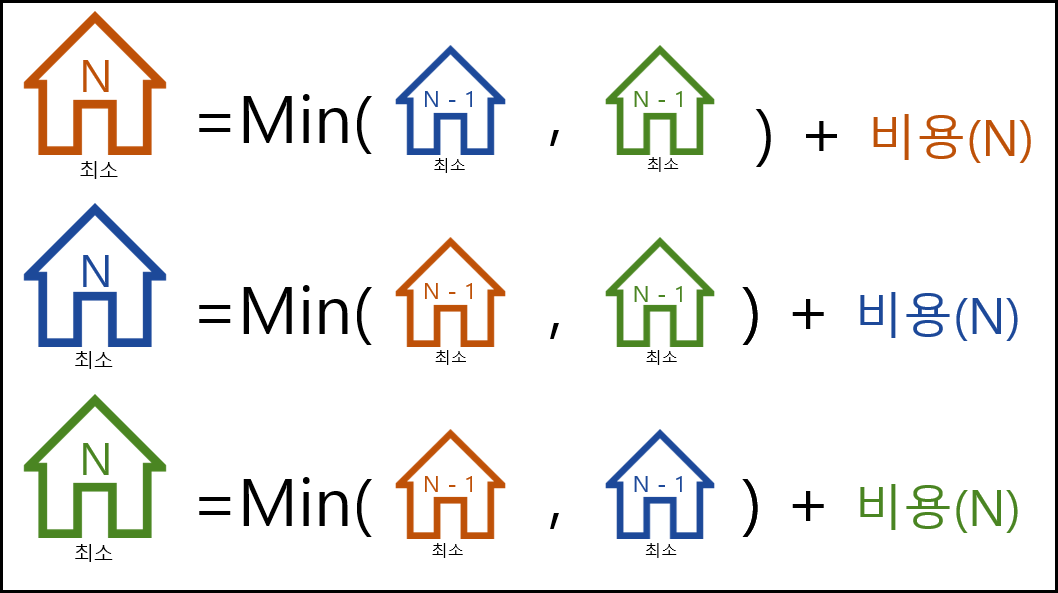 Min(n-1 번째 집을 초록색으로 칠하는 경우의 최소 비용, n-1번째 집을 파란색으로 칠하는 경우의 최소 비용) + n번째 집을 빨간색으로 칠하는 경우의 최소비용이 됩니다.