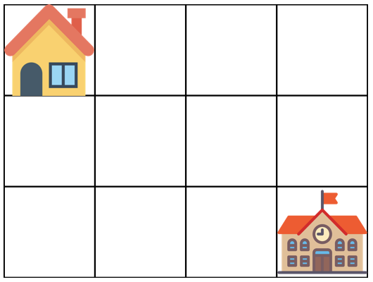 가장 왼쪽 위, 즉 집이 있는 곳의 좌표는 (1, 1)로 나타내고 가장 오른쪽 아래, 즉 학교가 있는 곳의 좌표는 (m, n)으로 나타냅니다.