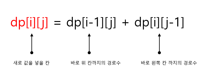 이동방향은 오른쪽과 아래 딱 두방향이기 때문에, dp[i,j]의 값은 다음과 같습니다.