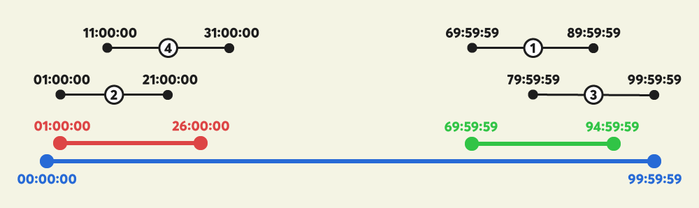| "99:59:59" | "25:00:00" | ["69:59:59-89:59:59", "01:00:00-21:00:00", "79:59:59-99:59:59", "11:00:00-31:00:00"] | "01:00:00" |