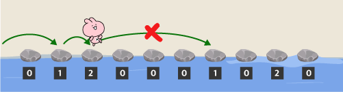 - 디딤돌의 숫자가 0이 되면 더 이상 밟을 수 없으며 이때는 그 다음 디딤돌로 한번에 여러 칸을 건너 뛸 수 있습니다.