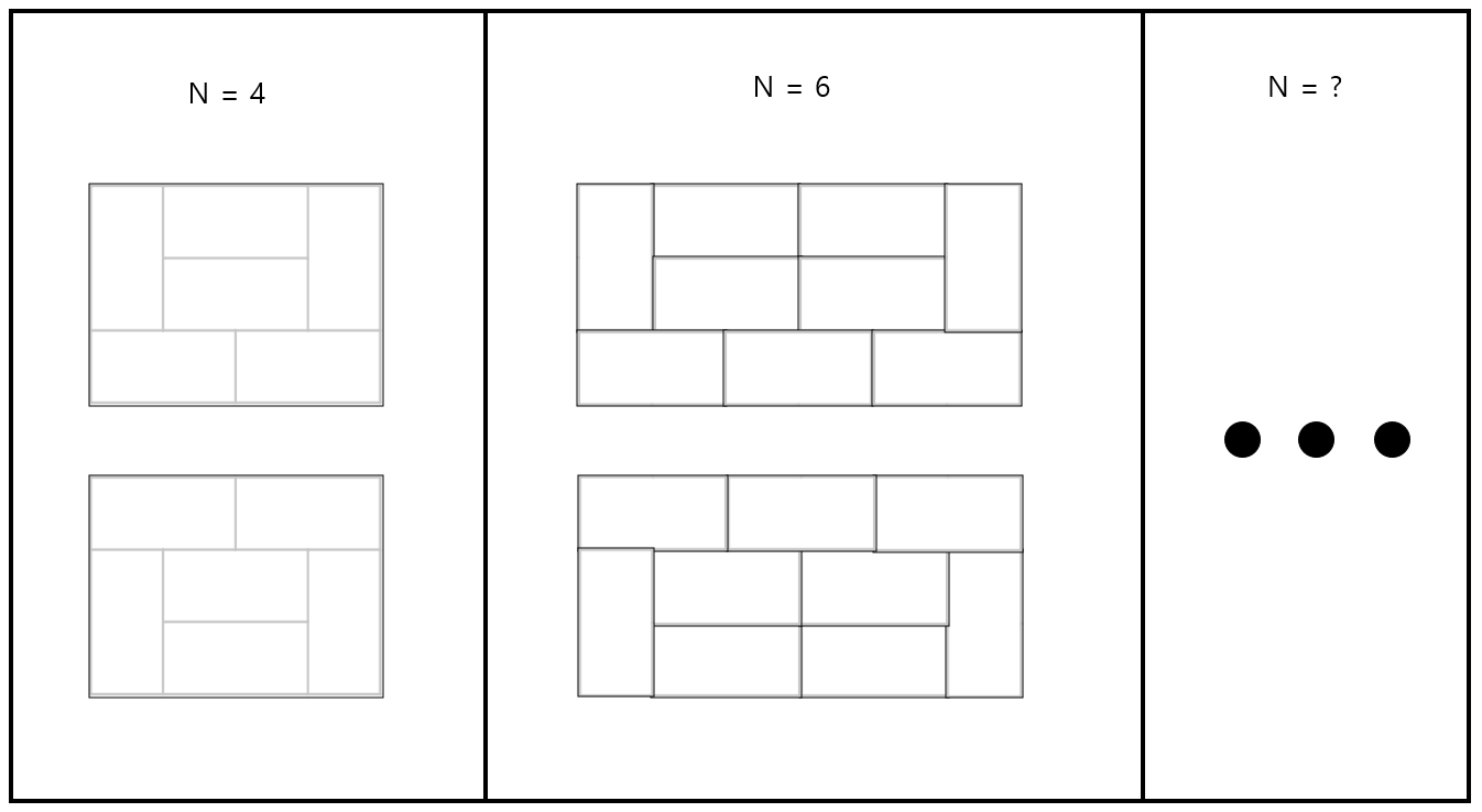 가로 길이가 2이고 세로의 길이가 1인 직사각형 모양의 타일이 있습니다. 이 직사각형 타일을 이용하여 세로의 길이가 3이고 가로의 길이가 n인 바닥을 가득 채우려고 합니다. 타일을 채울 때는 다음과 같이 2가지 방법이 있습니다