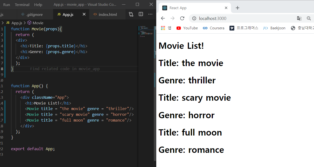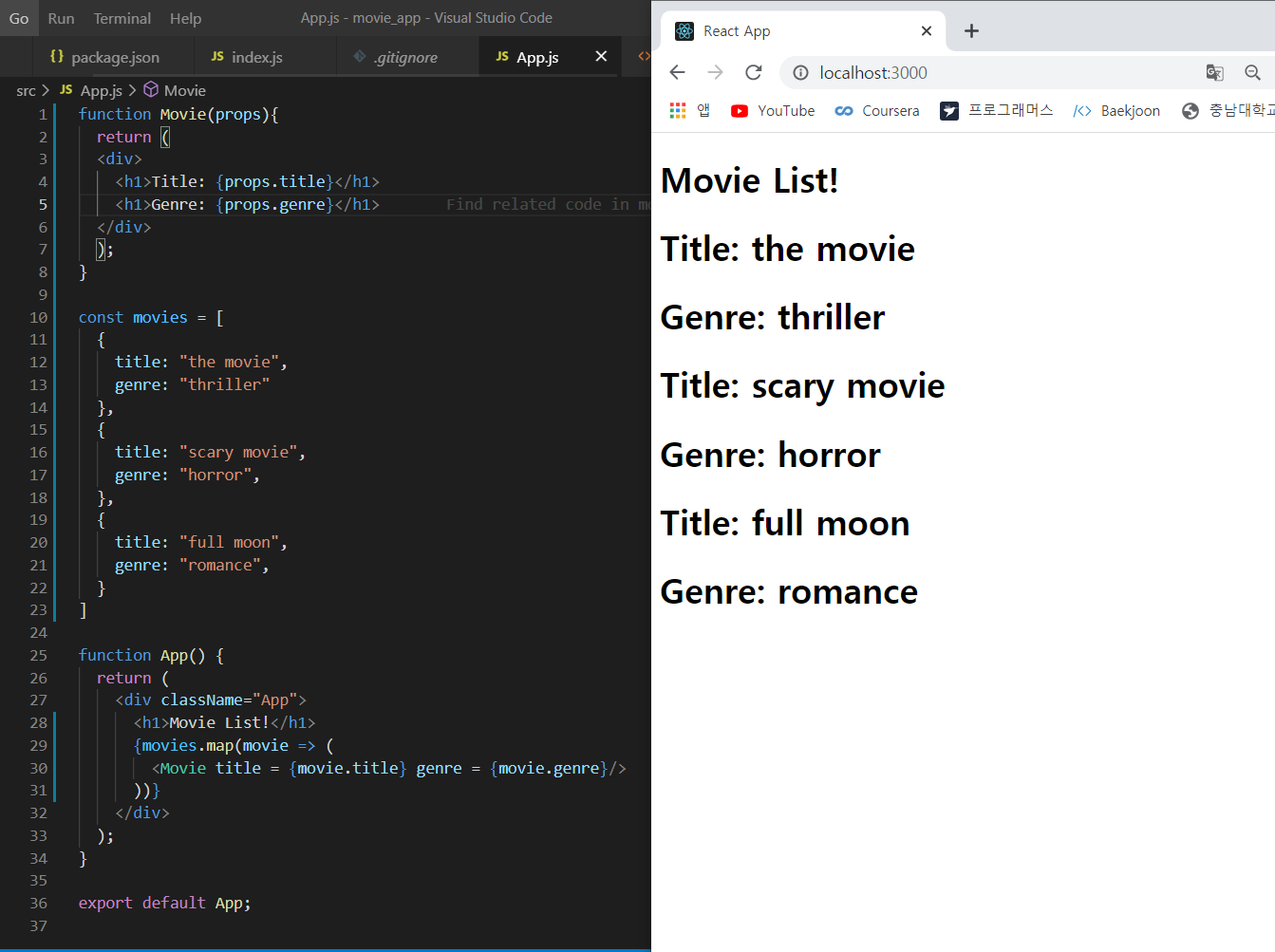 2번 예시의 이유가 사실 더 큰데, 실제로 영화리스트를 만든다고 하면, 사용하면서 새로운 영화들이 계속 추가되어야 할 것이다. 하지만 그 때마다 새로 Movie 컴포넌트를 추가하여 출력한다고 할 경우, 불필요한 코드 수정 요소가 생길 수 있다. 따라서 배열을 통해 영화 데이터들을 관리하면서, map() 함수를 이용한다면, 영화 객체를 추가만 하고 객체 사용부분에서는 코드를 수정하지 않아도 된다.