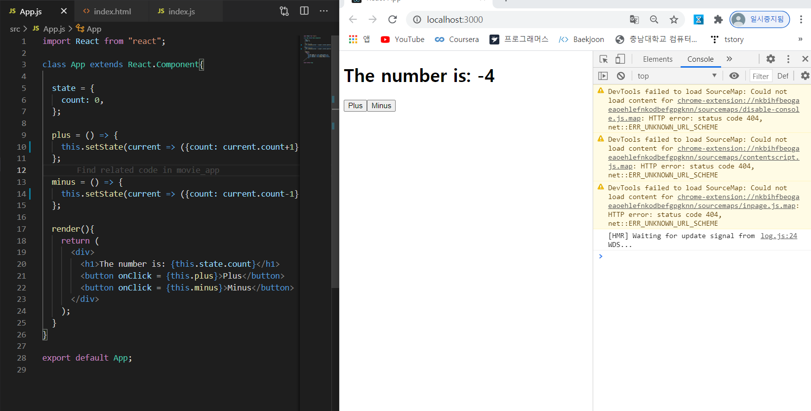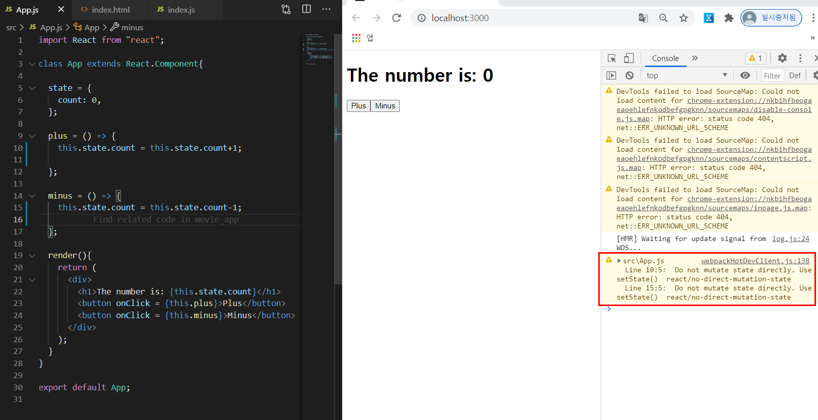 여기서 빨간색 네모를 보면 경고가 발생한 것을 알 수 있는데, state를 직접 변경하지 말라는 뜻이다.