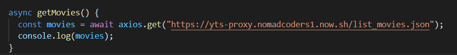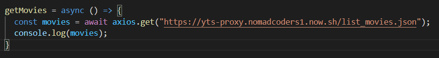 위처럼 async-await을 이용하여 구현할 수 있고, 이 경우 getMovies() 함수는 비동기로 진행될 것이며(async), axios.get(...)을 기다릴 것(await)이다.