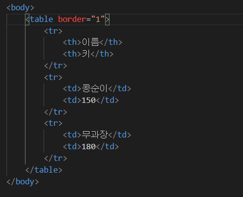 테이블을 만들어주는 태그이다. 우선 <table>태그를 통해 테이블 컨테이너를 만들어준다. <tr> 태그는 표의 한 행을 감싸는 태그이고, <th> 태그는 표의 제목 셀을 나타내는 태그이다. <td> 태그는 테이블의 데이터를 나타내는 태그이다.