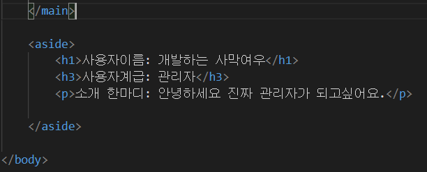 본문이 아닌 추가 정보를 감싸는 태그이다. 흔히 "사이드바" 라고 불리는 부분에서 이 태그를 사용한다. 블로그를 예로 들자면, 본문과는 관련없는 사용자 프로필, 사용자 소개 등이 이에 해당한다.