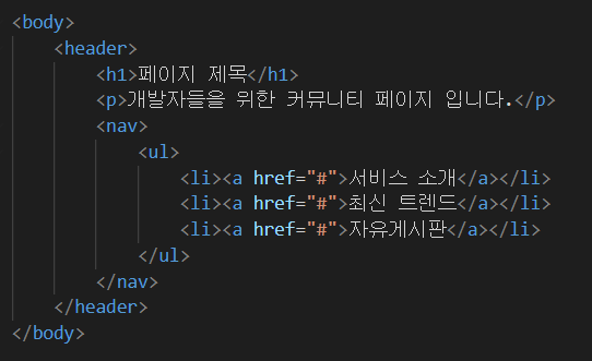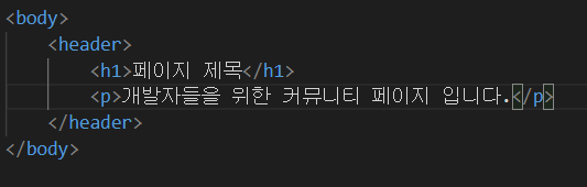 일반적으로 페이지 상부에 로고, 페이지 제목, 메뉴 등을 감쌀때 사용하는 태그이다. <head> 태그와 엄연히 다른 태그이다. <head> 태그는 웹 화면에 보이지 않는 내용을 다루는데 주로 사용하는 반면, <header> 태그는 웹 페이지 상단에 정보를 보여주고 그것을 일반적인 내용과 비교하기 위해 사용한다.