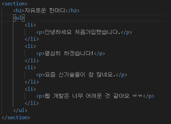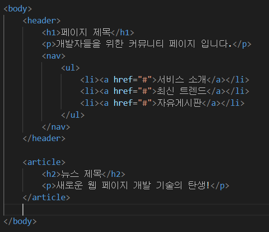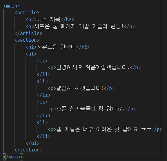 3. 그룹 태그: <article>, <section>, <div> 처럼 블록들의 그룹을 지정하는 태그
