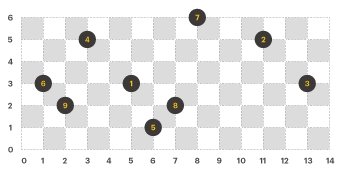 라이언의 규칙에 맞게 이진트리의 노드만 좌표 평면에 그리면 다음과 같다. (이진트리의 각 노드에는 1부터 N까지 순서대로 번호가 붙어있다.)