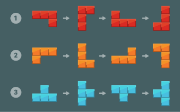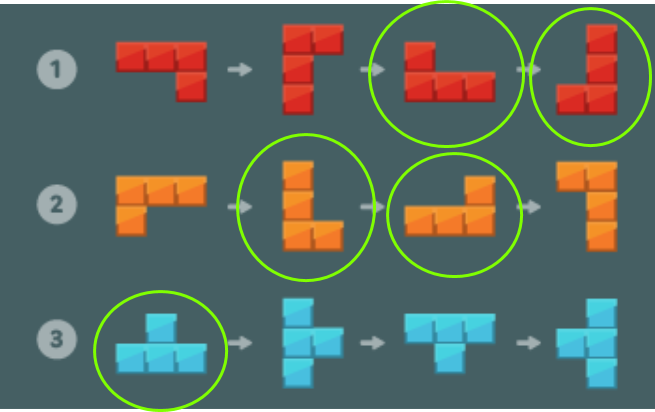 아래 그림과 같이 1×1 크기의 블록을 이어 붙여 만든 3 종류의 블록을 회전해서 총 12가지 모양의 블록을 만들 수 있다.