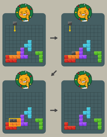 예를 들어 검은 블록을 떨어뜨려 아래와 같이 만들 경우 주황색 블록을 없앨 수 있다.