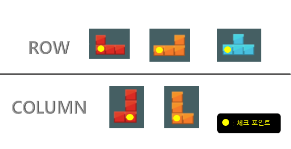 5가지 종류의 블록을 탐색의 편의를 위해 ROW와 COLUMN으로 구분하였다. 처음엔 true, false로 구분하였으나, ROW와 COLUMN이 아닌 그냥 튀어나온 부분일수도 있으므로, int형 값으로 설정하였다. 왼쪽 위에서부터 오른쪽 아래로 내려오며 반복문을 돌고, 해당 블럭이 ROW 형 블록인지 COLUMN형 블록인지 확인한다.