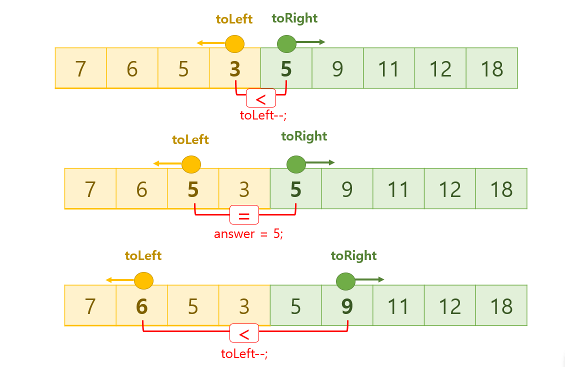 3가지 조건문을 if-else로 구현하여, toLeft와 toRight가 전체 배열 범위를 벗어나기 전까지 계속 진행한다. 이렇게 하면, 총 전체 포인터의 연산횟수(배열탐색횟수) 는 배열의 길이와 같아서 O(n)의 탐색시간만 소요된다(왼쪽으로 4칸, 오른쪽으로 5칸 = 전체 배열길이 9칸). 따라서 매번 새로 연산하면서 진행하는 것보다 훨씬 빠른 속도를 낼 수 있고, 효율성 테스트를 통과할 수 있게 된다.