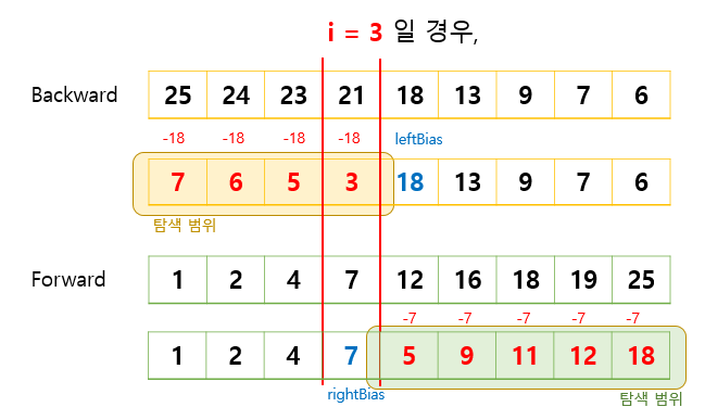 위의 memoization(forward[] / backward[])를 사용하여, 반복문을 돌며 탐색을 진행한다. 해당 i를 left의 시작(toLeft)으로, i+1을 right의 시작(toRight)으로 하여, 양쪽 끝까지의 범위가 left와 right의 탐색 범위이다. 여기서 투 포인터 알고리즘을 사용하게 되는데, 각 left과 right는 bias값(leftBias, rightBias)을 가지고 있다. 이 bias는 현재 위치 이전까지의 값을 빼주는 역할을 한다. 위의 그림에서 보면 left 탐색 범위에서는 leftBias인 18을 빼주었고, right 탐색 범위에서는 rightBias인 7을 빼 주었다.