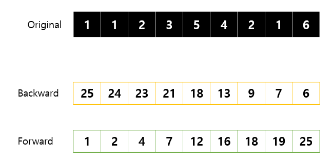 1. 정방향으로 더해나가는 forward[] 배열과, 역방향으로 더해나가는 backward[] 배열을 만든다.