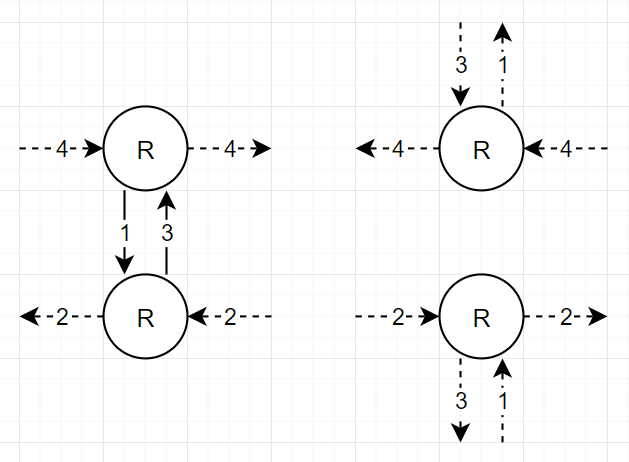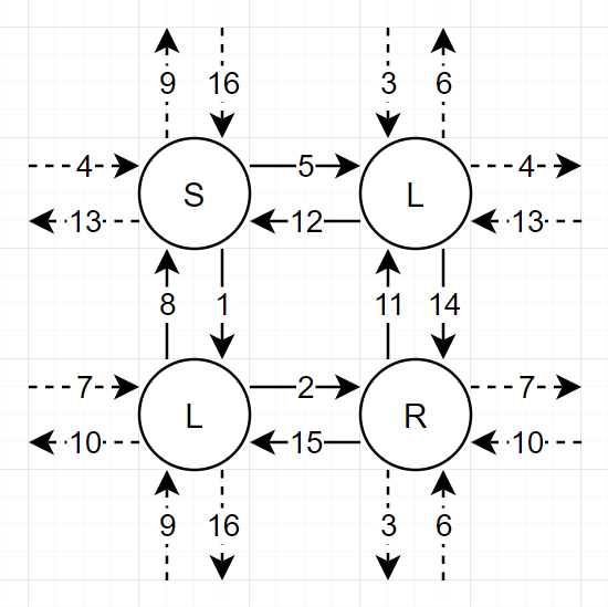 또한, 문제에 S, R, L 뿐이 없다는 뜻은, 뒤로 돌아가는 칸이 없다는 뜻이므로, 이는 사이클이 최소한 하나는 무조건 생긴다는 뜻이 됩니다. 다시 말해, 어떤 routes에서 빛을 쏘던 해당 routes로 돌아오는 것은 필연적이기 때문에, 이를 염두하며 완전탐색을 구현하면 문제를 풀 수 있습니다.