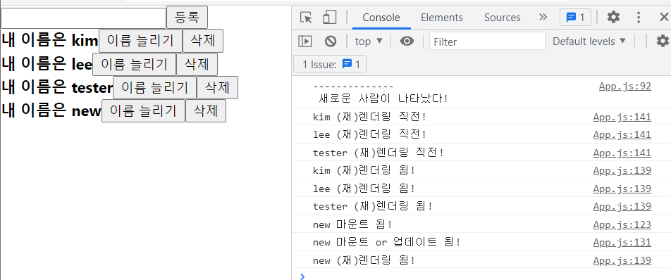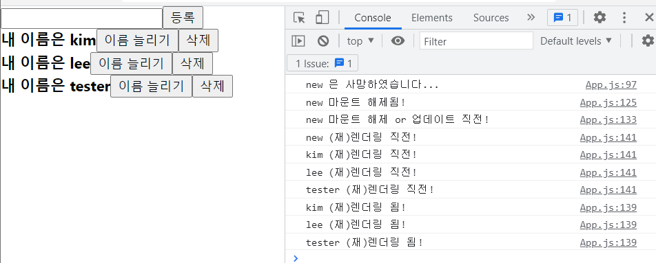 new가 마운트 해제 되면서, new의 1,2 번 useEffect()의 cleanup 함수가 실행되고, App의 재렌더링 직전이 되어 모든 컴포넌트의 3번 useEffect()의 cleanup 함수가 실행되었다. App의 재렌더링 이후엔, new는 없어졌기 때문에 원래 3명의 사람(컴포넌트) 만 재렌더링 되었다.