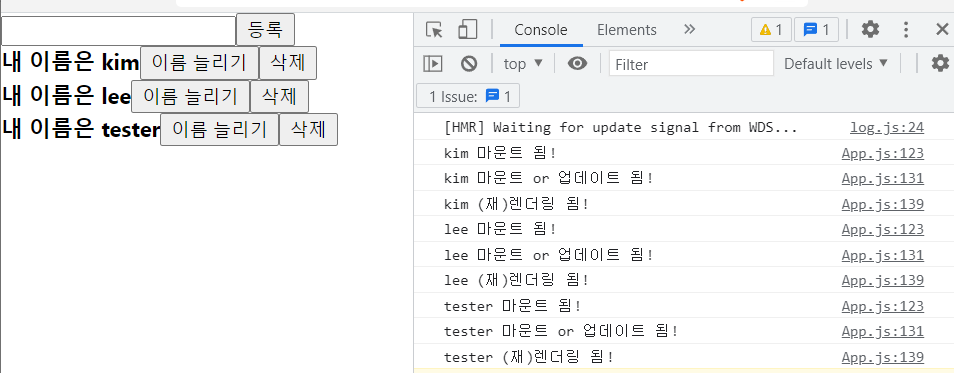 4. 특정 컴포넌트 값 변경시(kim의 이름을 늘렸을 때)