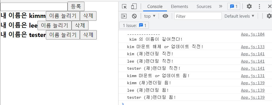 new가 마운트 해제 되면서, new의 1,2 번 useEffect()의 cleanup 함수가 실행되고, App의 재렌더링 직전이 되어 모든 컴포넌트의 3번 useEffect()의 cleanup 함수가 실행되었다. App의 재렌더링 이후엔, new는 없어졌기 때문에 원래 3명의 사람(컴포넌트) 만 재렌더링 되었다.