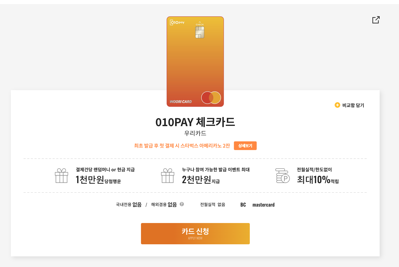 이번에 체크카드를 뭘 발급받지 고민하다가, 우리 카드의 010PAY 체크카드를 발급받았다.