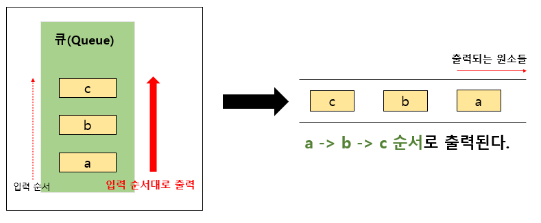큐는 FIFO니, a -> b -> c 순서대로 들어간 입력을 그대로 c -> b -> a 순서대로 출력해주게 됩니다. 좀 더 쉬운 예시를 들면, 줄을 서있는 사람들을 생각해보면 됩니다. 사람들이 은행업무를 보기 위해 줄을 서서 기다리고 있습니다. 당연히 먼저 기다린 사람이 먼저 업무를 봐야하지 않을까요? 이것이 바로 큐입니다.
