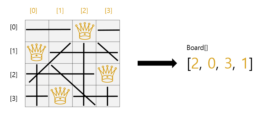 2차원 판을 1차원으로 표현해준 것입니다. 배열의 각 인덱스는 몇 번째 row인지를 알려주는 것이고, 배열의 각 값은 몇 번째 column인지를 알려주는 것입니다. 이렇게 구현하면, 최소한의 메모리로 최대한의 표현을 할 수 있게 됩니다. 아래 그림은 위 예시를 board로 표현한 것인데, 0번 row에는 2번 column에 퀸이 위치해있으므로 board[0] = 2이고, 1번 row에는 0번 column에 퀸이 위치해있으므로 board[1] = 0입니다. 이하도 동일합니다.
