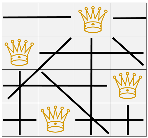 이 N-Queen 문제는 N x N의 체스판에 N 개의 퀸을 서로 공격할 수 없게 두는 문제로, 백 트래킹 알고리즘의 정석과도 같은 문제라고 할 수 있습니다. 한 줄마다 퀸을 하나씩 두되, 서로의 공격범위안에 서로가 들어가 있지 않아야 하죠.