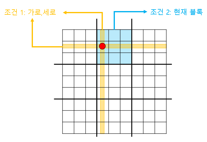 블록 내 판단을 할 때에는 n과 m을 각각 3으로 나눠 블록의 인덱스를 알아오고, 해당 블록 인덱스에 0~3을 더해가며 탐색을 진행하게 됩니다.