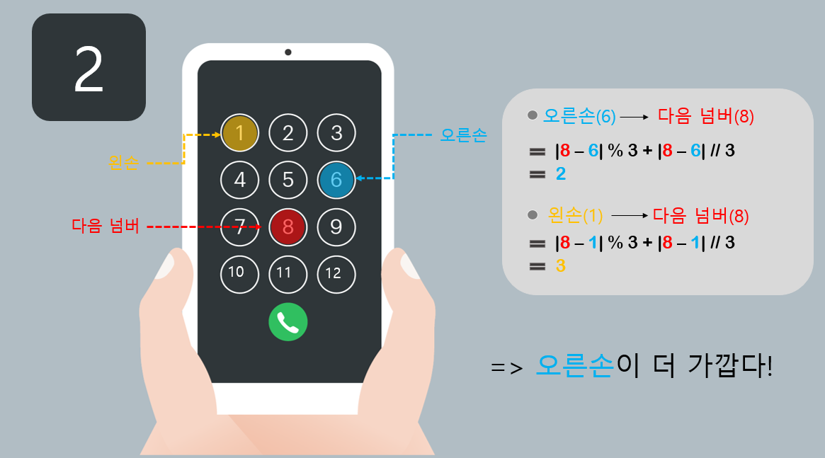 1. 엄지손가락은 상하좌우 4가지 방향으로만 이동할 수 있으며 키패드 이동 한 칸은 거리로 1에 해당합니다.