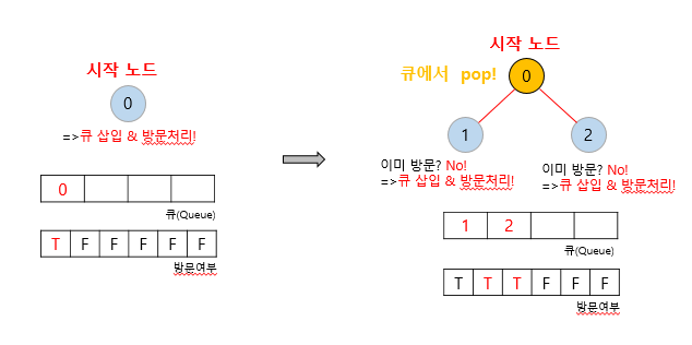 처음에 시작노드를 큐에 삽입하고 방문처리 합니다. 그럼 큐에 시작 노드 0이 들어가있는 상태가 됩니다.