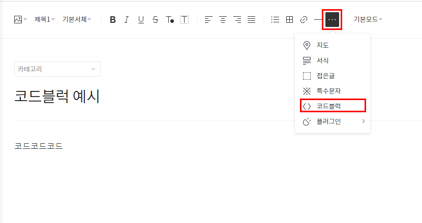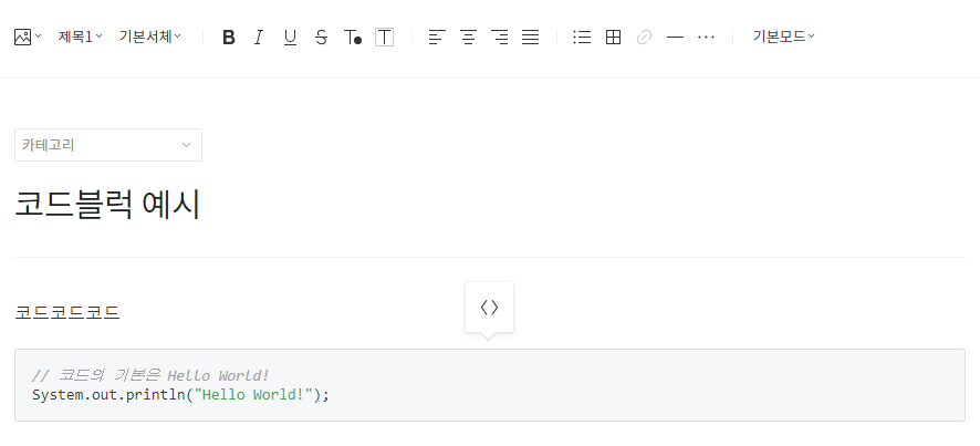 1. 글쓰기 에디터 > 코드블럭 클릭 |
