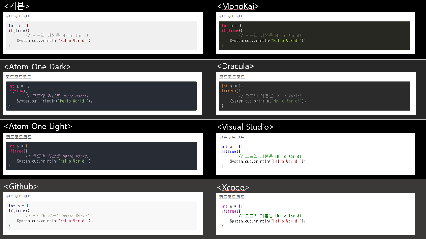 여러 IDE를 두루두루 사용해보신 분들은 테마 명만 봐도 머릿속에 그려지긴 하시겠지만, 참고용으로 테마별 적용사진을 올려봅니다.