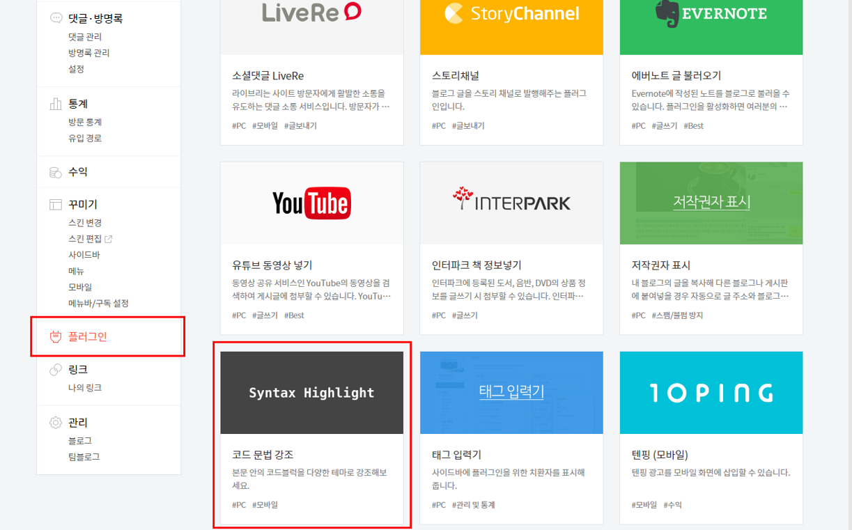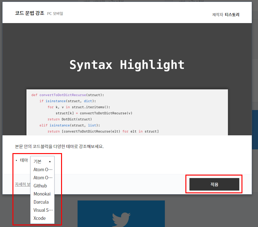 티스토리에서 자체적으로 제공하는 플러그인을 사용하면 되므로, 굉장히 간단합니다. 테마도 종류가 여러가지니, 자신의 티스토리 스킨이나 디자인에 맞게 선택하면 될 것 같습니다.