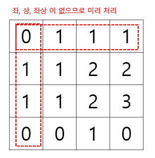 - 배열[1][:]과 배열[:][1]에 대해서는 좌, 상, 좌상이 없으므로 미리 처리