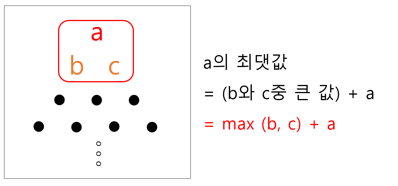 맨 위층 7부터 시작해서 아래에 있는 수 중 하나를 선택하여 아래층으로 내려올 때, 이제까지 선택된 수의 합이 최대가 되는 경로를 구하는 프로그램을 작성하라. 아래층에 있는 수는 현재 층에서 선택된 수의 대각선 왼쪽 또는 대각선 오른쪽에 있는 것 중에서만 선택할 수 있다.