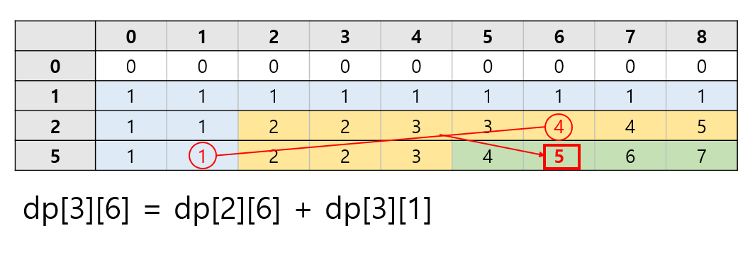 여기서 보면, 2원이 추가 되었을 때, 2원보다 큰 값에서만 2가 포함된다. 5원이 추가되었을 때에도, 5원보다 큰 값에서만 5가 포함된다.