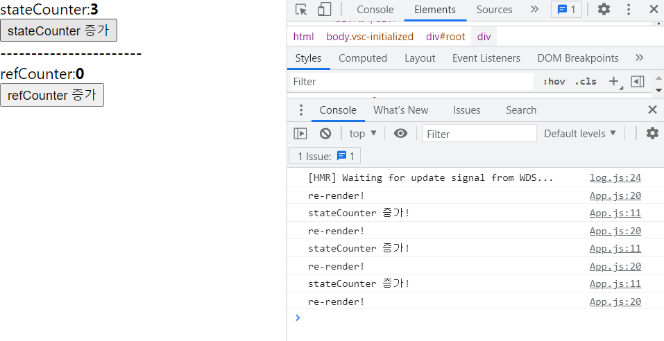 반면, 'refCounter를 증가'를 3번 클릭할 경우 콘솔 창을 통해 refCounter 값이 증가된 것은 보이지만, 리렌더링이 이루어지지 않으므로 DOM 업데이트 또한 이루어지지 않는다. 대신, 새로고침을 하거나 stateCounter를 증가시켜 렌더링을 다시 시킨다면, 업데이트된 refCounter값이 올바르게 표시된다.