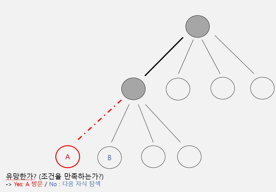 - DFS 방식으로 탐색 -> 자식 노드(A)의 유망성(들어가도 되는가) 확인