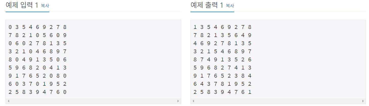 게임 시작 전 스도쿠 판에 쓰여 있는 숫자들의 정보가 주어질 때 모든 빈 칸이 채워진 최종 모습을 출력하는 프로그램을 작성하시오.